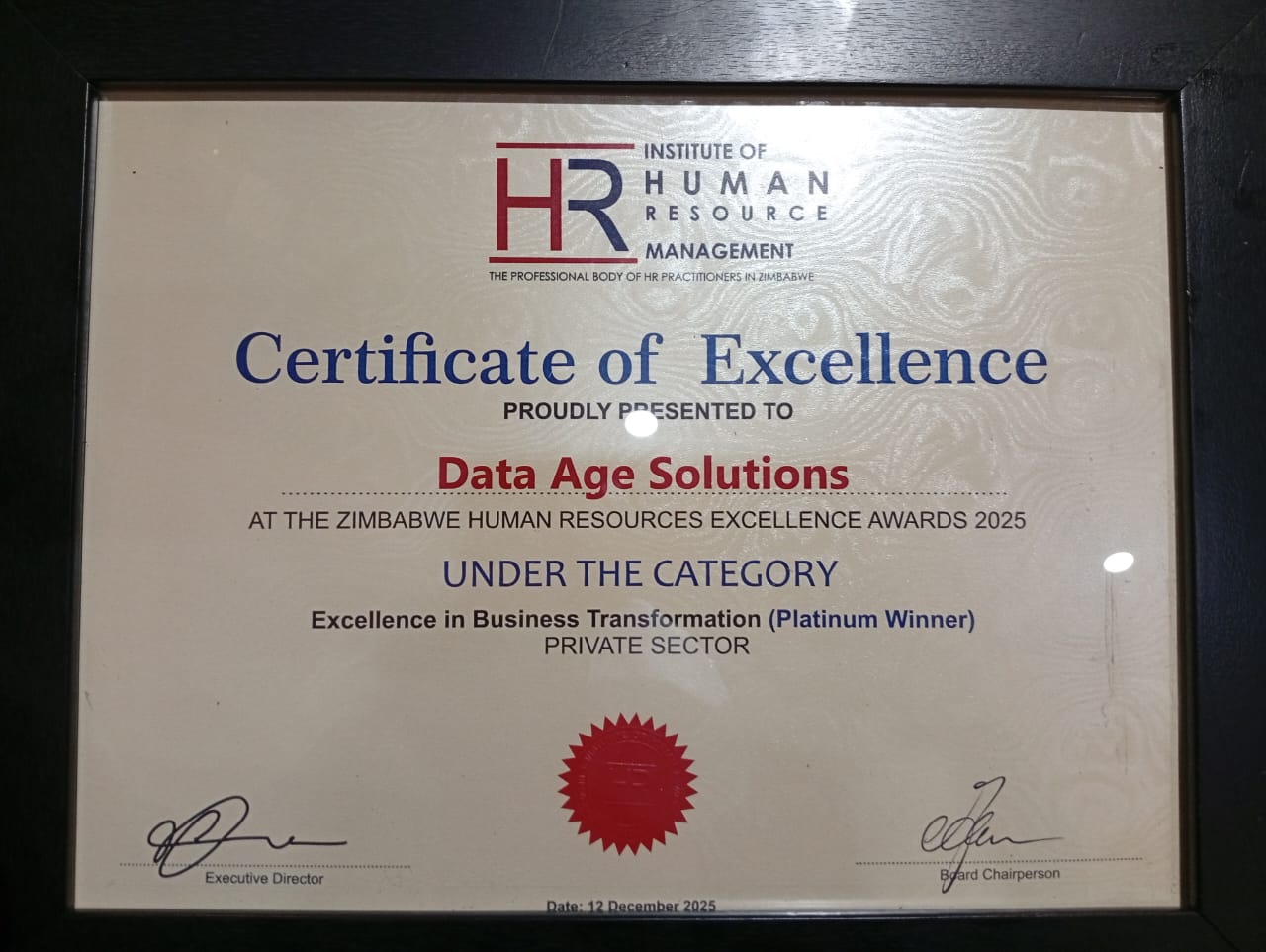 We are profoundly honored and delighted to announce that Data Age Solutions has been awarded the Platinum Award for Excellence in Business Transformation at the prestigious Zimbabwe Human Resources Excellence Awards 2025, hosted by the Institute of Human Resource Management (IHRM).